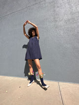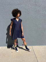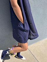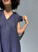 This shift mini dress is as effortless as it is elegant and fun. Featuring special sleeves, hidden side pockets and embellished with our festive night lights embroidery on rich navy handloom woven cotton. Fully lined.