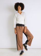 An effortlessly chic wrap shirt, crafted from handloom woven organic cotton poplin. In a crisp white with elegant contrast stitching. Features a v neckline with a hidden snap closure, a subtle puff sleeve with elastic cuffs, and a functional wrap design that ties at the back waist.