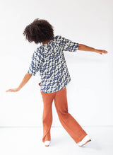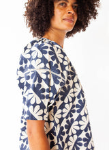 With its loose raglan sleeves, flowy feel, and dahlia hand block print, this top is as joyful as frolicking through fields of florals. Rich with delicate details and unique touches: an asymmetrical hem, ladder trim at the cut seams, stylish gathering at the neckline, and a keyhole button closure.
