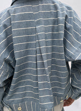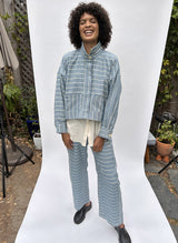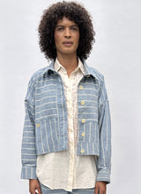 Cropped and collared with a boxy fit, the Tulsi Jacket is the perfect all-weather layer. Relaxed but structured, easy but ultra cool. Features a hidden button placket and two front pockets, plus buttons at the wide-cuff sleeves and adjustable tabs at back hem for adjusting the fit. Handloom woven using post-consumer recycled cotton.