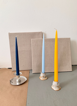 Illuminate your table with this set of 2 tall taper candles. Made from a quality blend of waxes and beautiful dyes, these candles are artfully hand dipped using old techniques by Danica Candles in Maine. Long-burning, unscented, solid color.