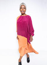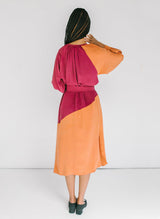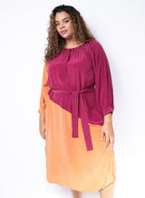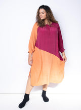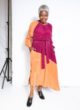 Your new favorite wear-anywhere dress. Crafted from a luxe silk crepe and colored with 100% natural dyes in fuchsia and persimmon, the Caz is both elevated and utilitarian. Gathered sleeves and rich color blocking add flair, while the button neckline and side slits offer ultimate movability. Worn loose, the Caz has the feel of a tunic, but it also comes with a tie belt to create a more form-fitting silhouette. A light, easy, and shape-shifting piece for all seasons.
