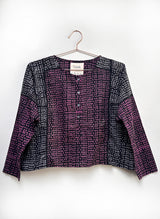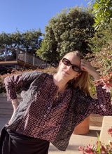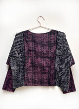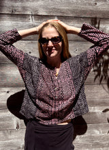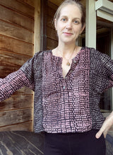 An update to the Sara Dress, this time as a slightly cropped top. Effortless to throw on and go. Featuring a button placket at the center front, gussets at the armhole, bracelet length sleeves, and ladder trimming in the seams.