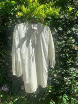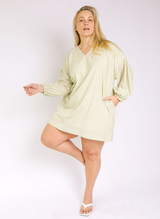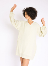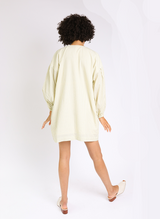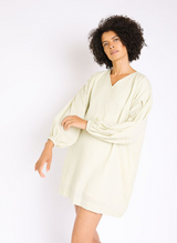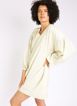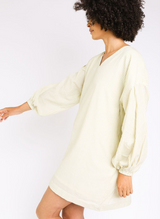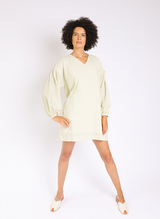 A chic shift dress with a little something special: streamlined puff sleeves with elasticated cuffs and an elegant v-neck. Made from naturally dyed and handloom woven cotton, featuring our sweet matcha stripe. Fully lined, with convenient side pockets.