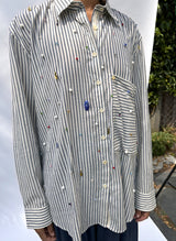 This perfect unisex button down shirt was designed for all. A classical staple with an oversized front pocket and looser fit. At first I wondered if the beading on this one was “enough” but I realized it represents to look closer and pay attention to joys and beauty that sometimes don’t get enough appreciation. Now this one might be my favorite as it is covered with lots of small jewel-like beads that twinkle in the light.
